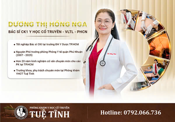 Phòng khám Y học cổ truyền Tuệ Tĩnh là địa chỉ đáng tham khảo, nơi bác sĩ CKI Dương Thị Hồng Nga trực tiếp thăm khám và điều trị. Bác sĩ tốt nghiệp Đại học Y Dược TP.HCM, chuyên ngành Y học cổ truyền kết hợp Vật lý trị liệu – Phục hồi chức năng.