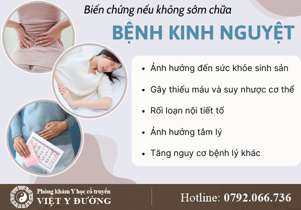 Bệnh kinh nguyệt không chỉ gây khó chịu tạm thời mà còn ảnh hưởng lâu dài đến sức khỏe và tâm lý của phụ nữ nếu không được điều trị đúng cách. Một số tác hại thường gặp gồm: